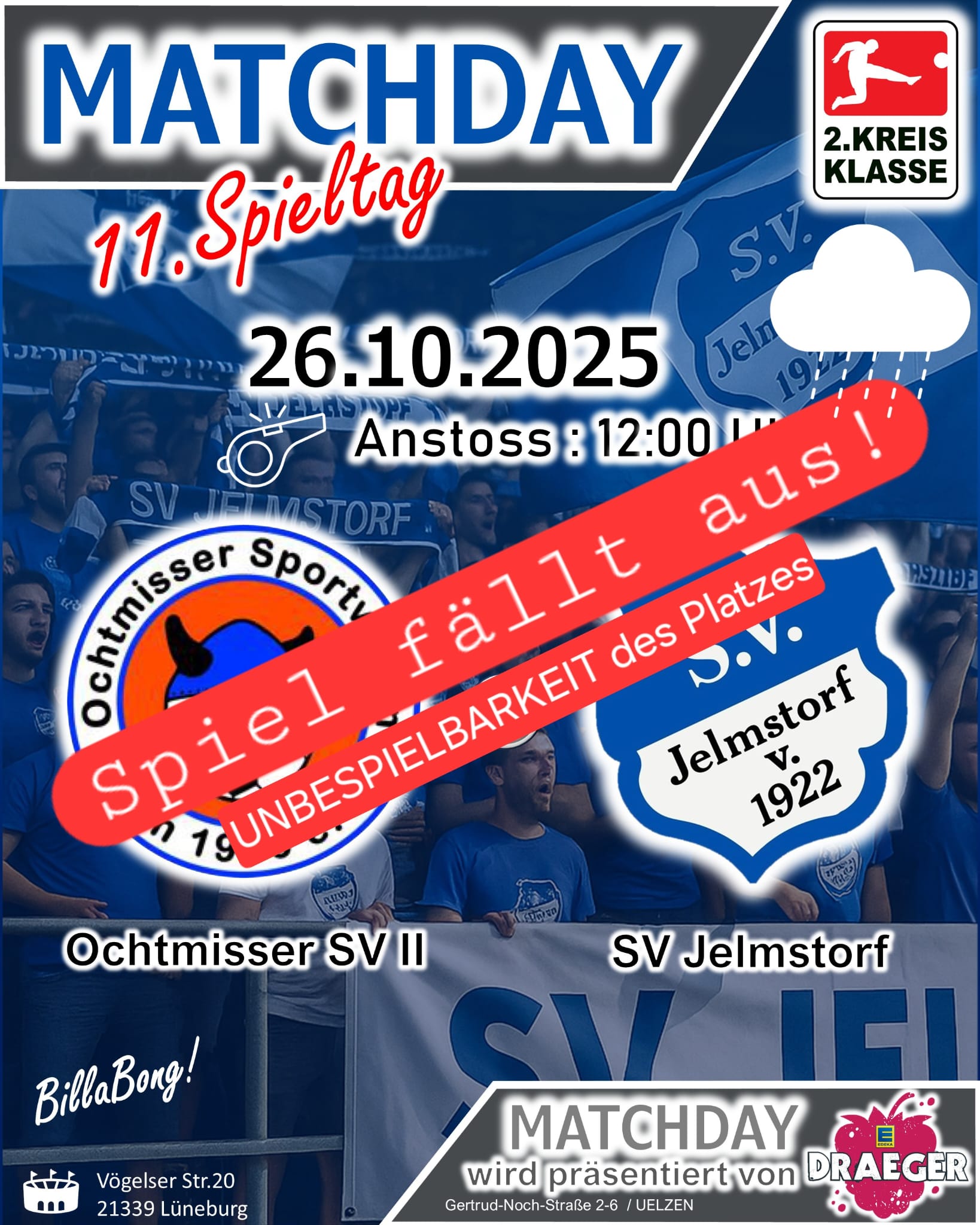 Wie vermutet fällt das Nachholspiel gegen den Ochtmisser SV II aus. Der SVJ wünscht ein schönes Restwochenende!